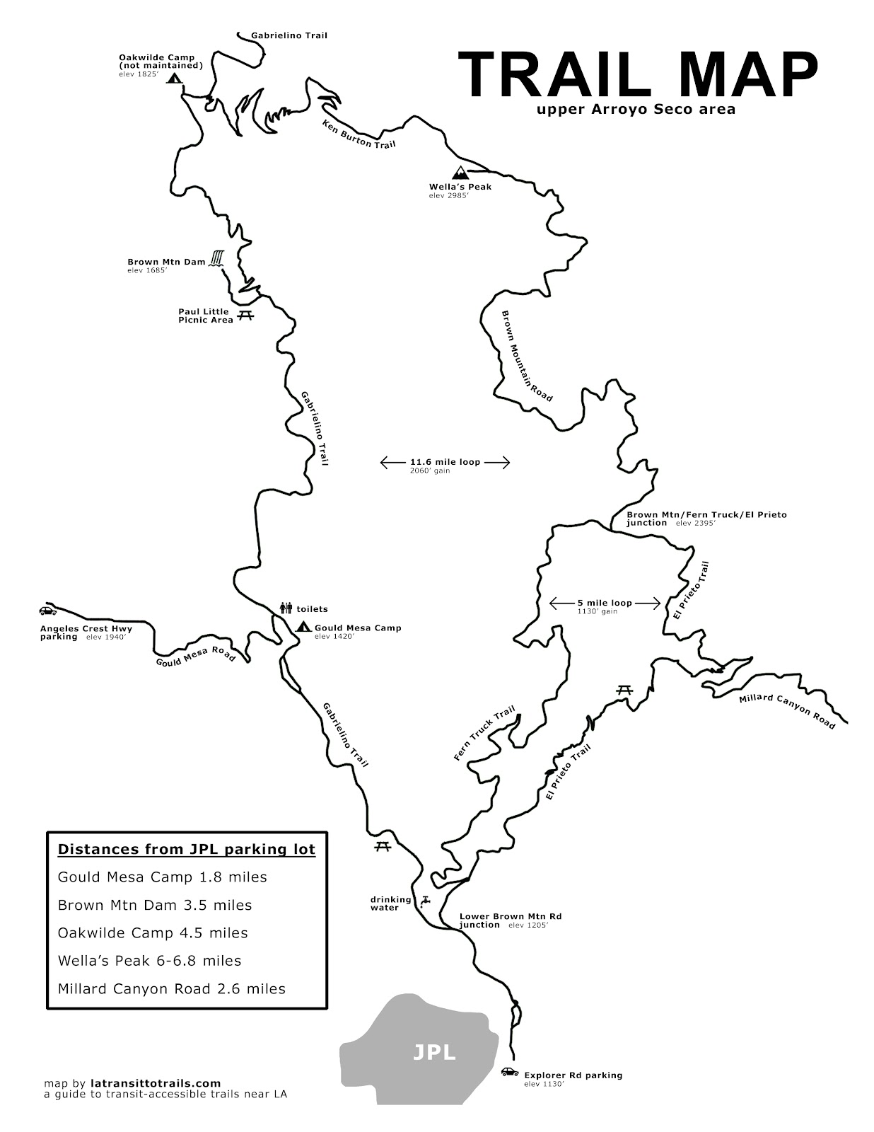 Water and toilet are at Loma Alta Park on Lincoln .25 mile north of the bus stop. A coffee shop and diner are at the bus stop. Water is on the Gabrielino trail .8 mile from the trailhead, and a toilet 2 miles from the trailhead at Gould Mesa. Metro Micro rideshare is available in this area.